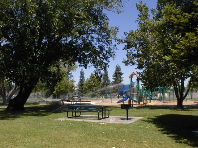 A neighborhood park that includes two full sized soccer fields, picnic tables, and a play area.